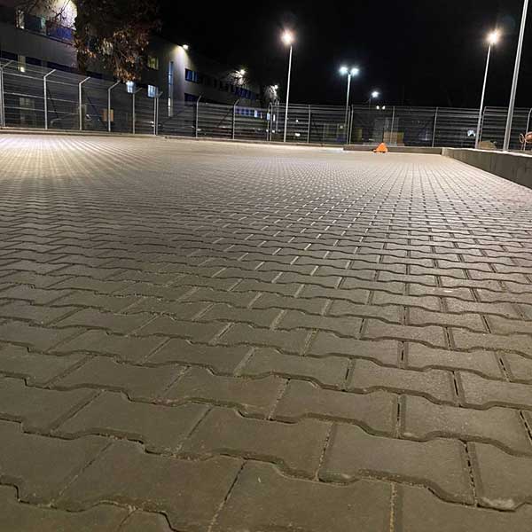 Замощення бруківки на підготовленій поверхні проводимо від країв до середини ділянки. Опісля трамбуємо віброплитою із гумовою підкладкою. В результаті бруківка повинна опуститися приблизно на 1 см нижче. Наявні щілини засипаються сухим піском. Рекомендуємо повторити цю операцію кілька разів, попередньо зволоживши шви між бруківкою.